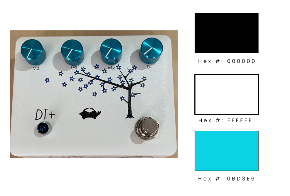 There was no accent color for the brand, however. Only using black and white seemed a little too bland. Therefore, I took inspiration for the blue I chose from the color of the knobs on the first pedal he designed, the Diamondback Terrapin (DT+). This would provide a bit of fun and whimsy per the brand’s identity, as well as emulate water that the turtle in the logo could appear to swim in.